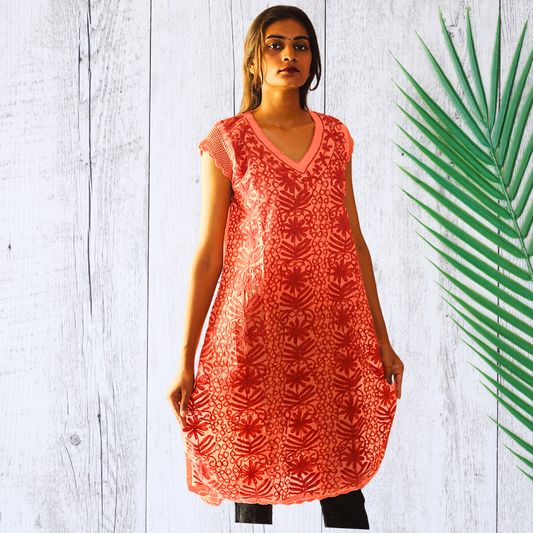 KurtiVerse Short Sleeve Cotton Chikan Embroidery Kurti for Women - Peach