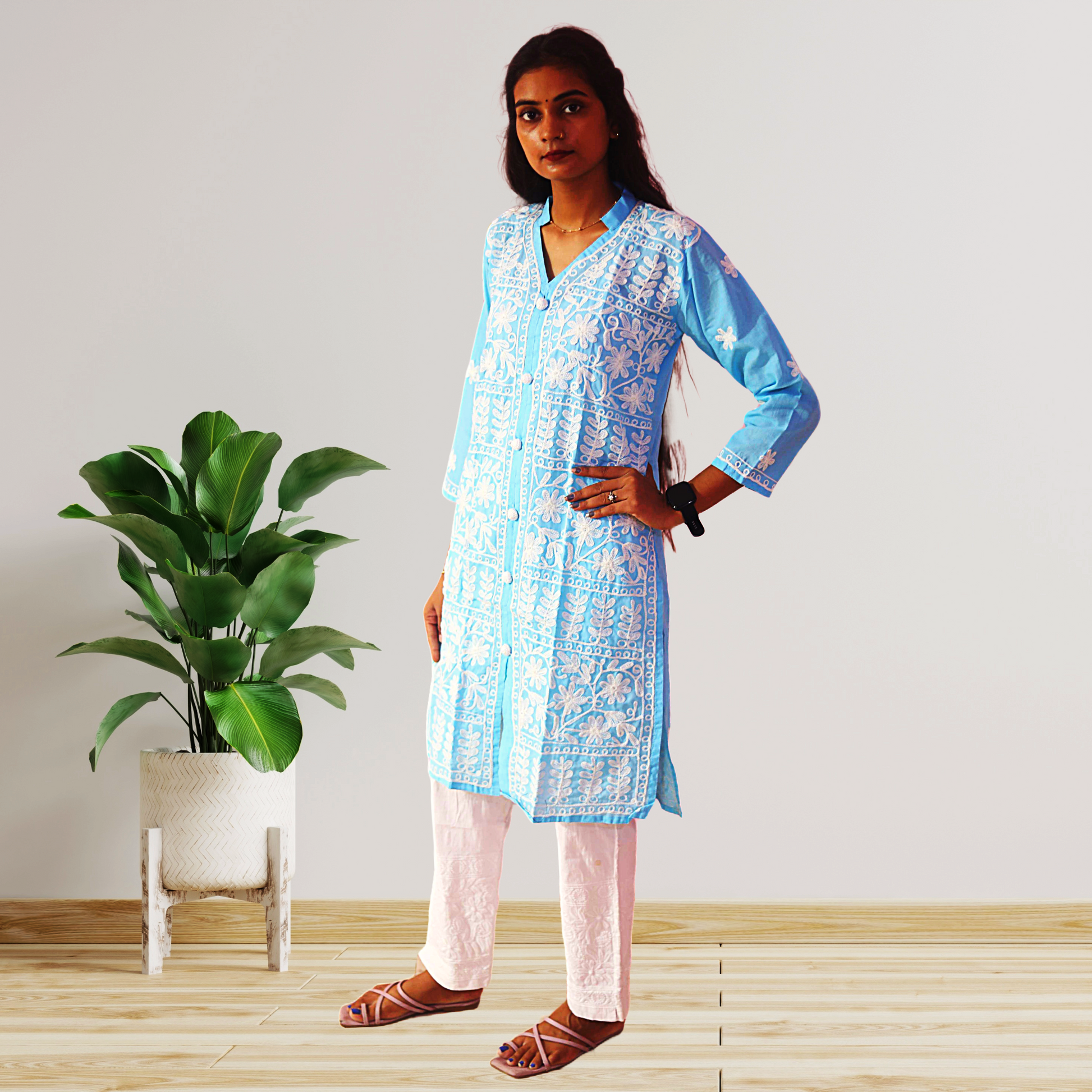 KurtiVerse Cotton Kurti for Women Sky Blue Embroidery Kurta