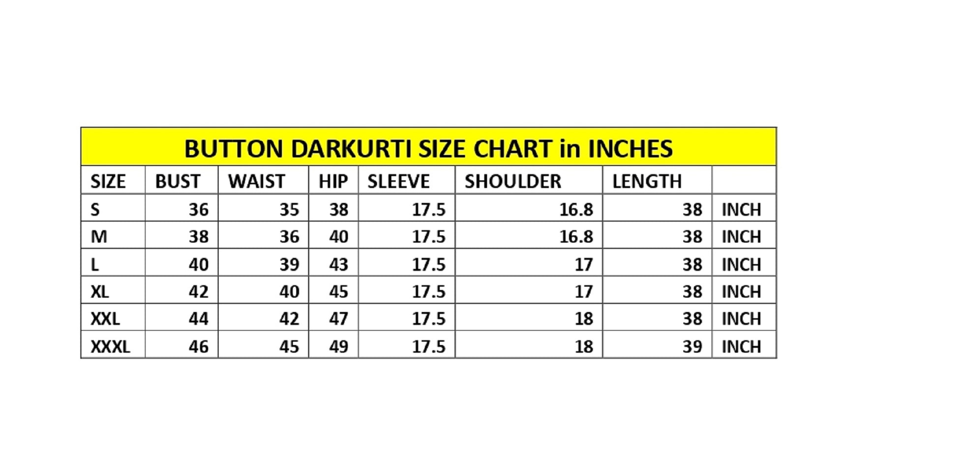 - Size Guide - S: Bust Size – 36 inches M: Bust Size – 38 inches L: Bust Size – 40 inches XL: Bust Size – 42 inches XXL: Bust Size – 44 inches 3XL: Bust Size – 46 inches