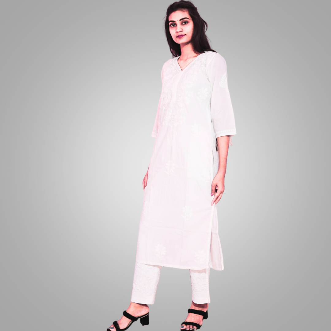 KURTIVERSE White Pure Cotton V Neck Kurti Women Chikankari Kurta