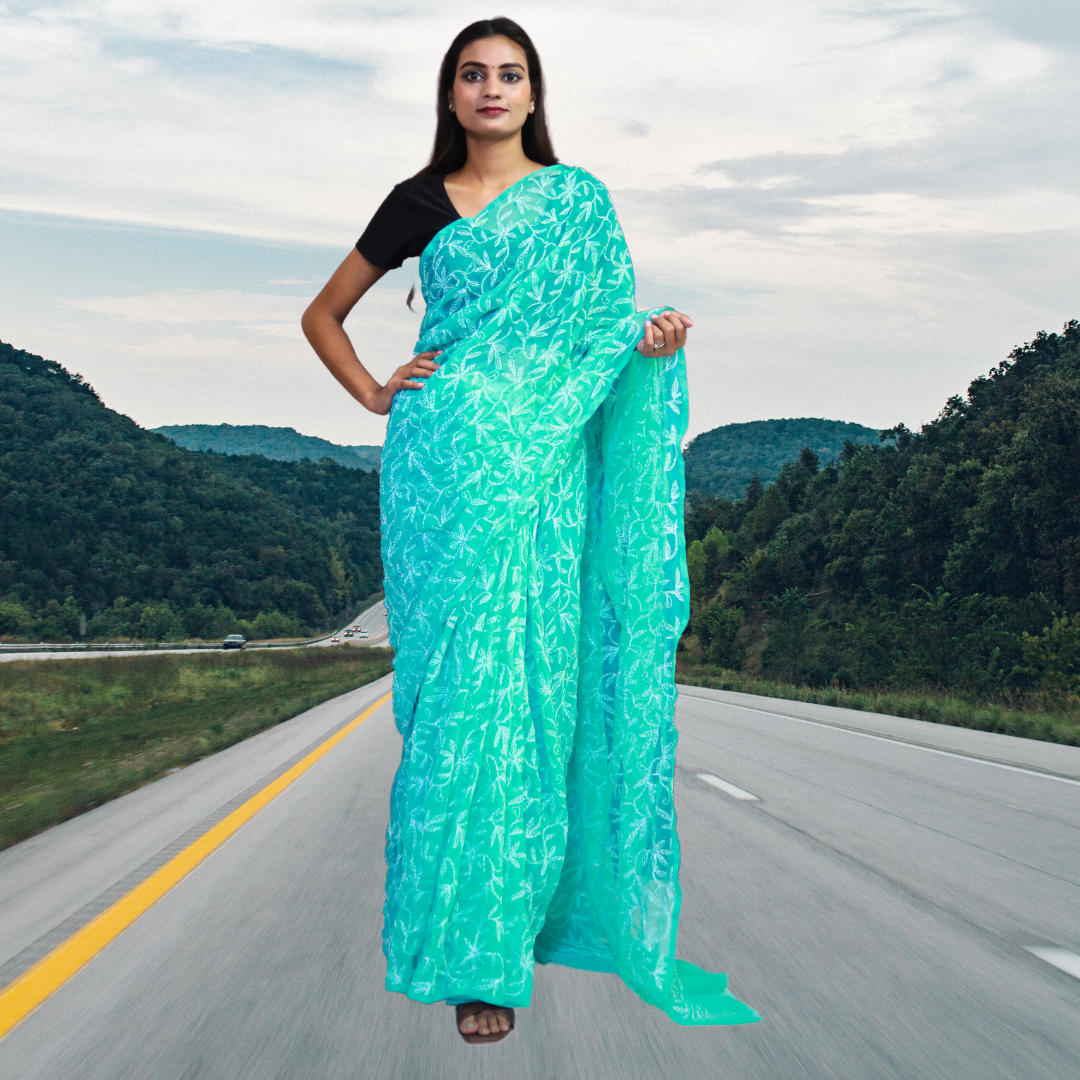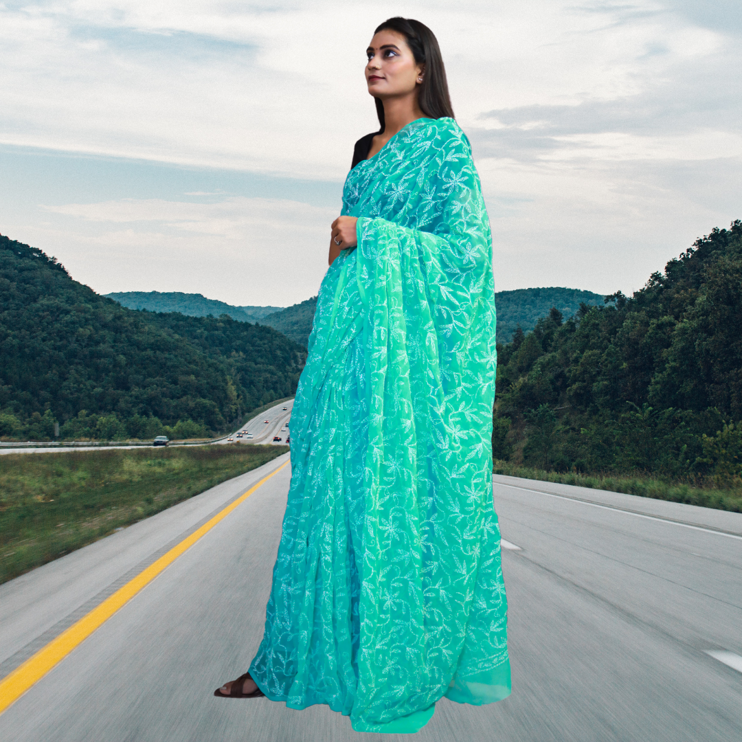 KURTIVERSE Women Chikankari Hand Embroidery Saree Blouse,Ocean Blue