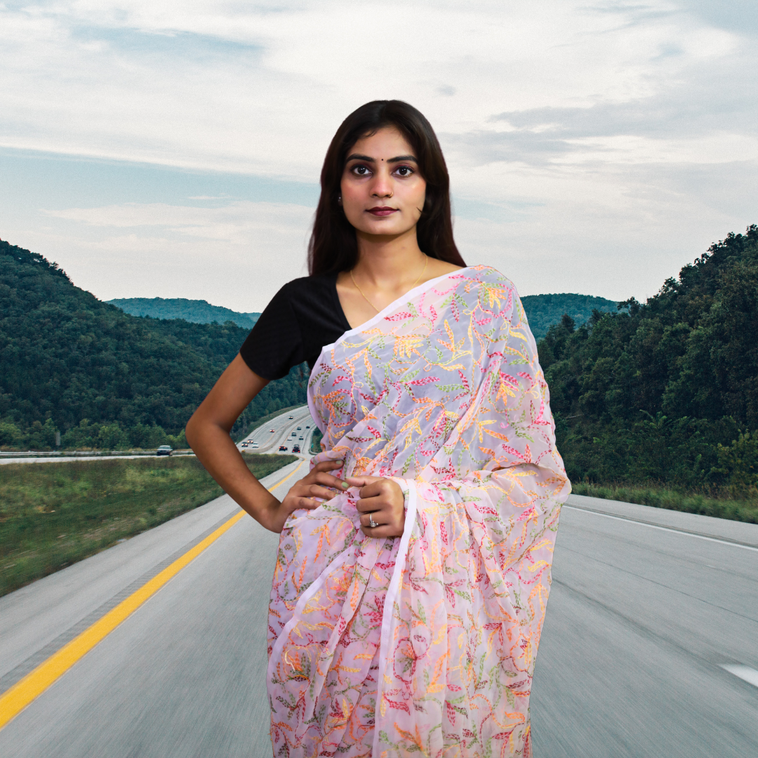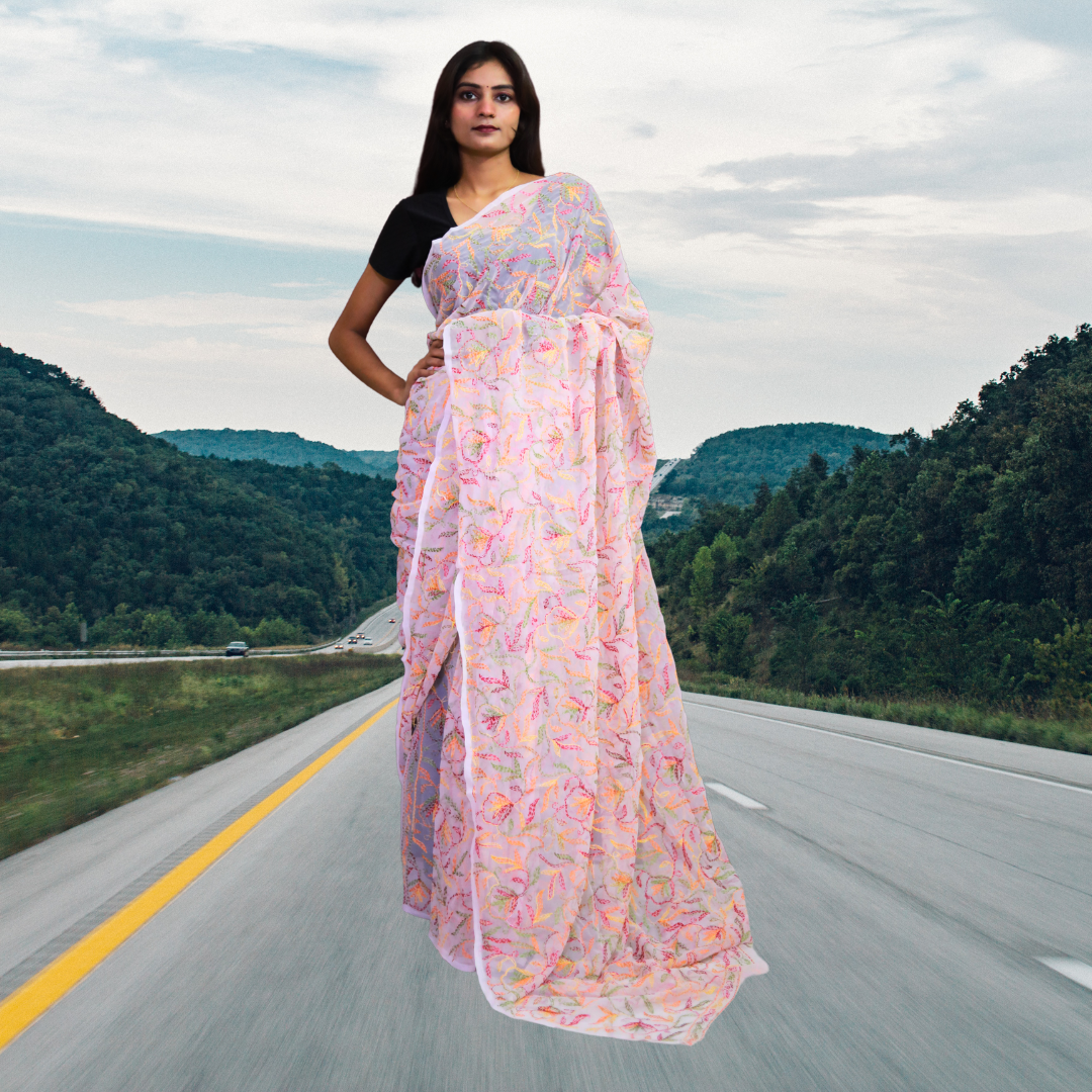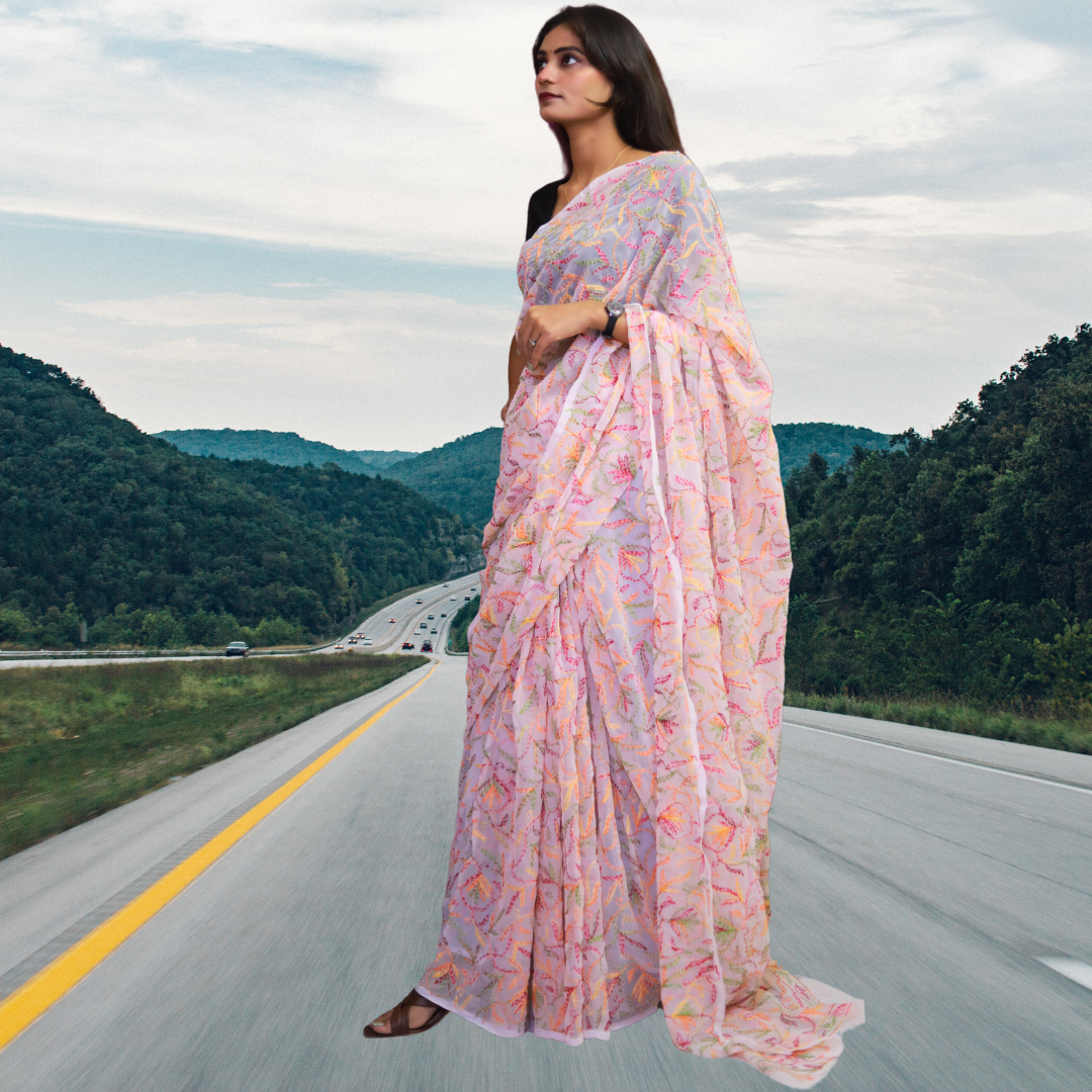 KURTIVERSE Women Chikankari Hand Embroidery Saree Blouse,Pink Multi