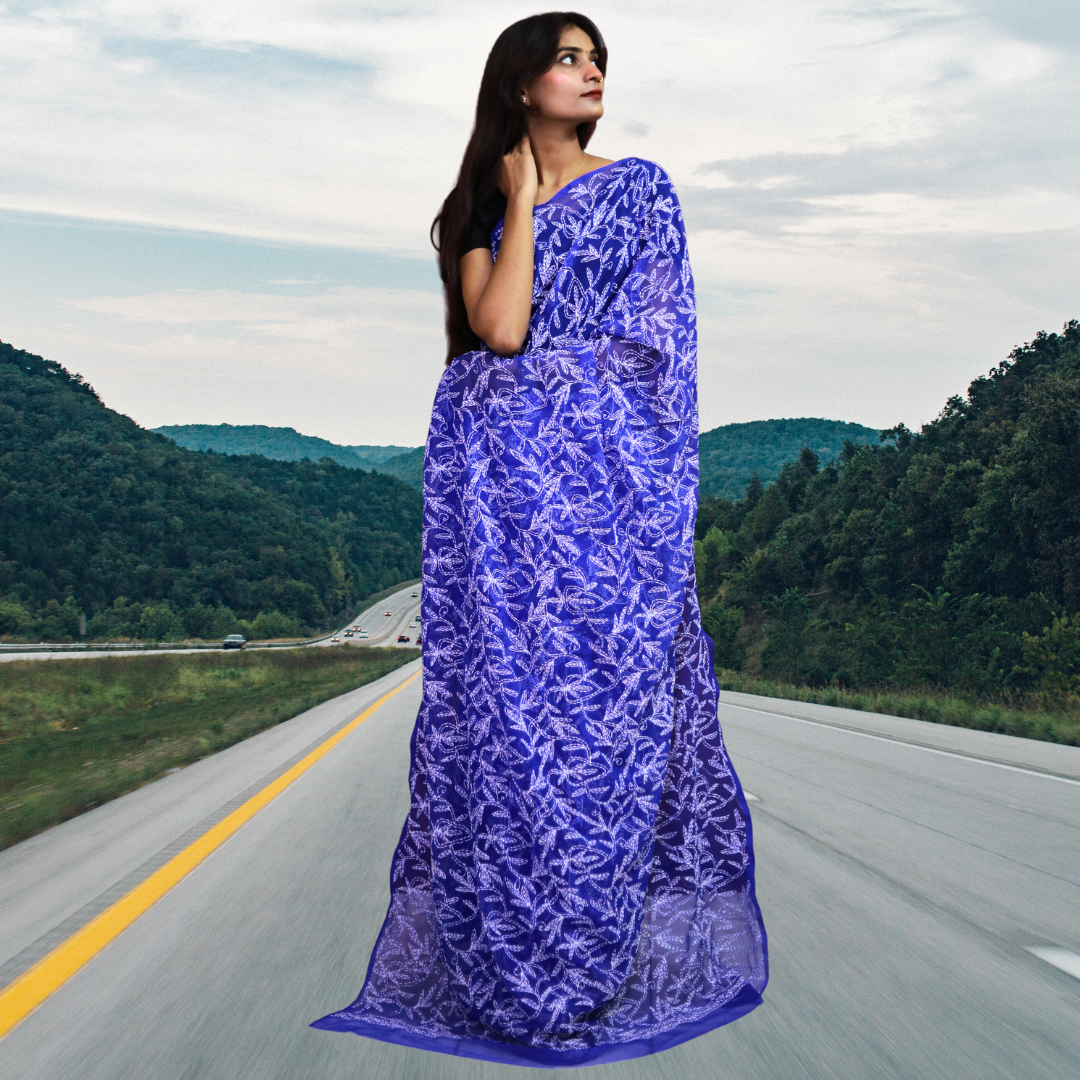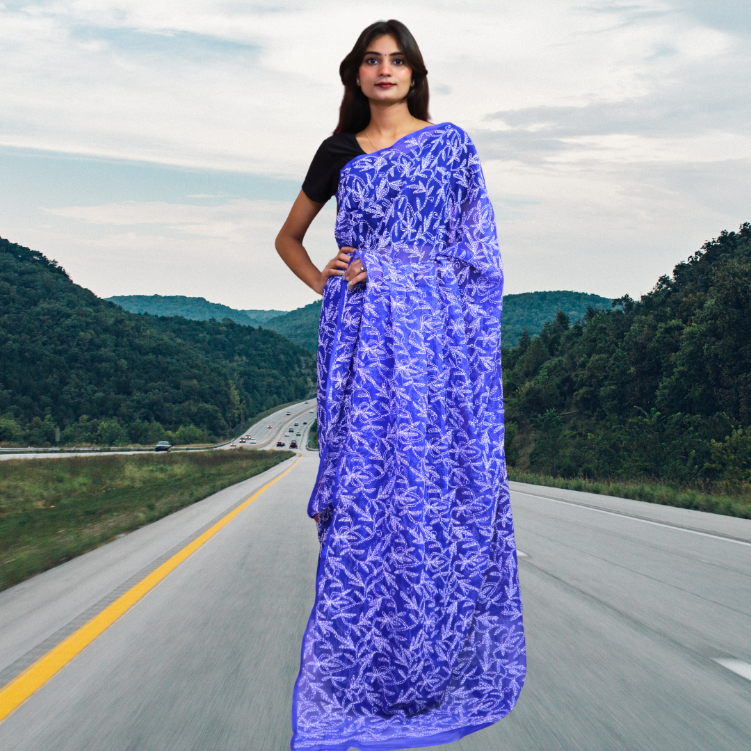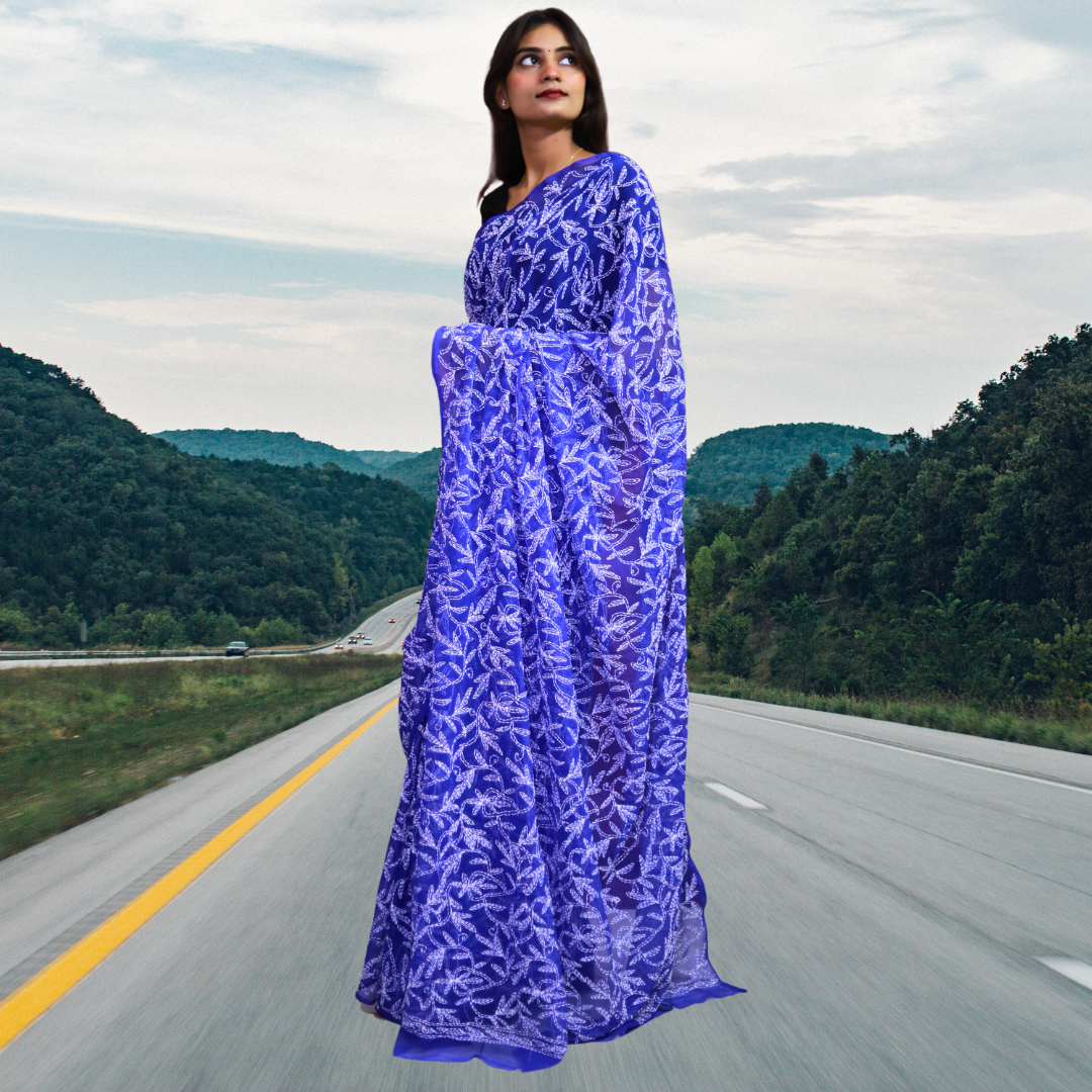 KURTIVERSE Women Chikankari Hand Embroidery Saree Blouse, Royal Blue