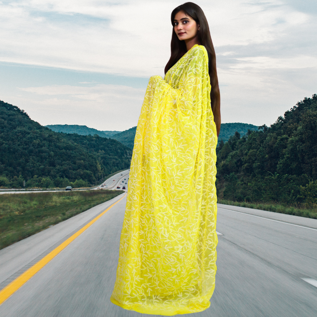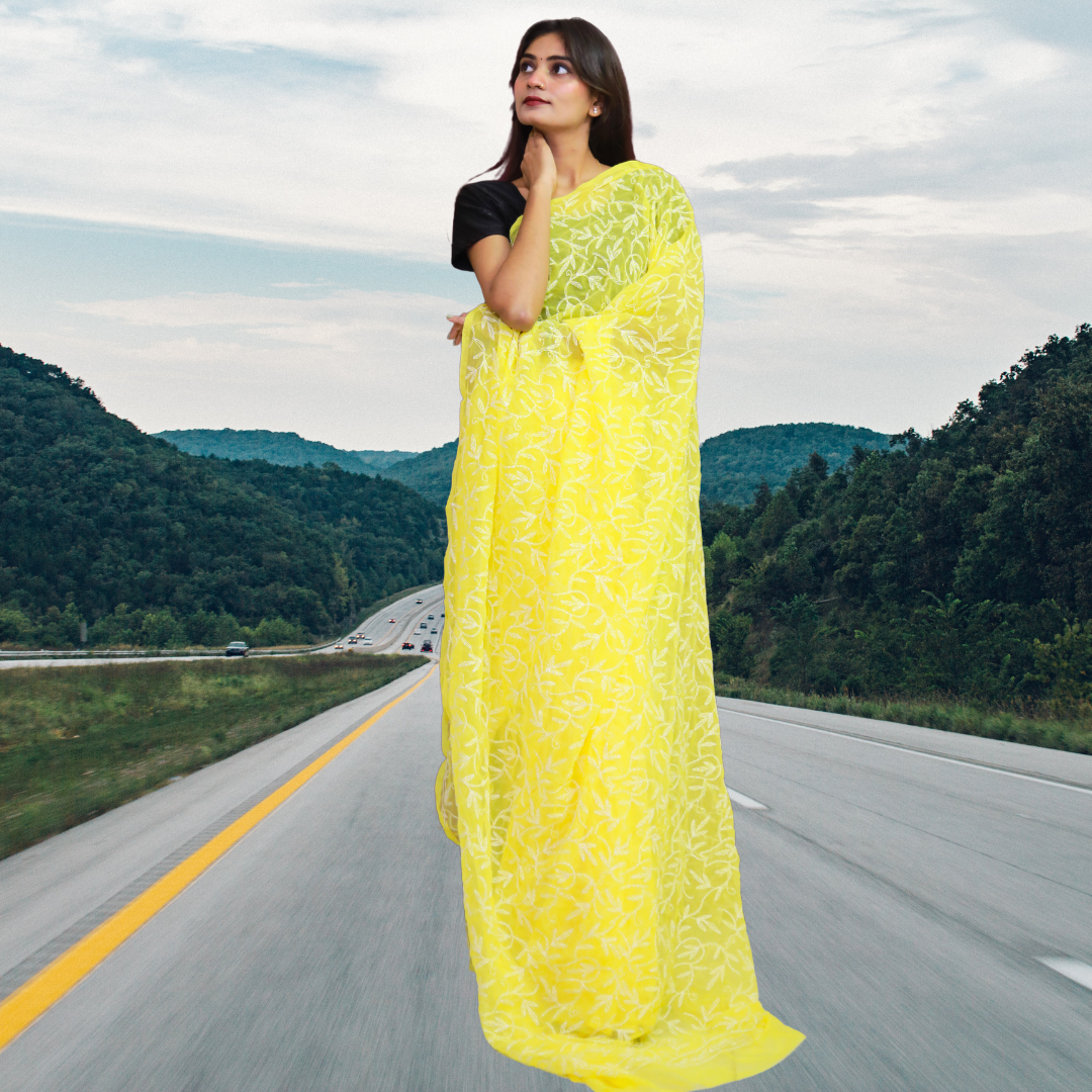 KURTIVERSE Women Chikankari Hand Embroidery Saree Blouse, Yellow
