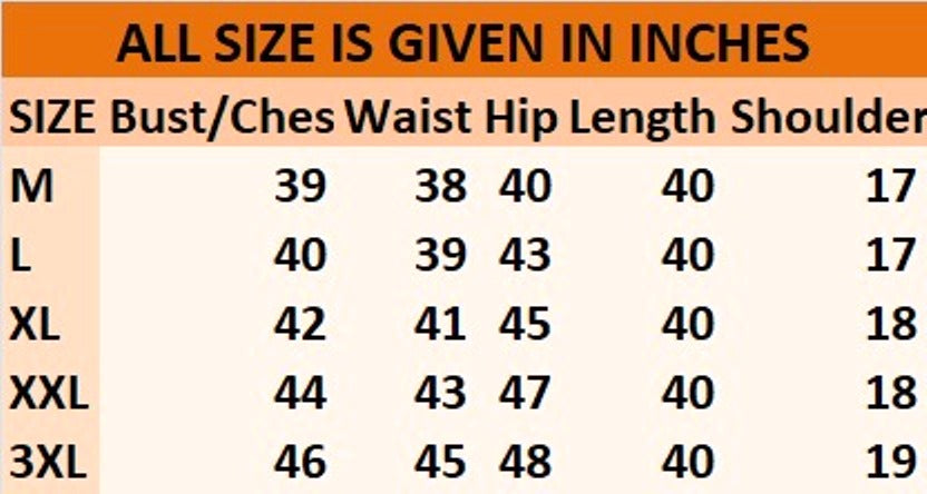 size Guide --- -------- M-39 inch bust size, Waist - 38 inch, Hip - 40 inches, Length - 40 inches. L-40 inch bust size, Waist - 39 inch , Hip- 42 inches, Length - 40 inches. XL-42 inch bust size, Waist - 41 inch, Hip - 44 inch , Length - 40 inches XXl-44 inch bust size, Waist - 43 inch, Hip - 46 inch , Length - 40 inches. 3XL-46 inch bust size, Waist - 45 inch , Hip- 48 inch, Length- 40 inches.