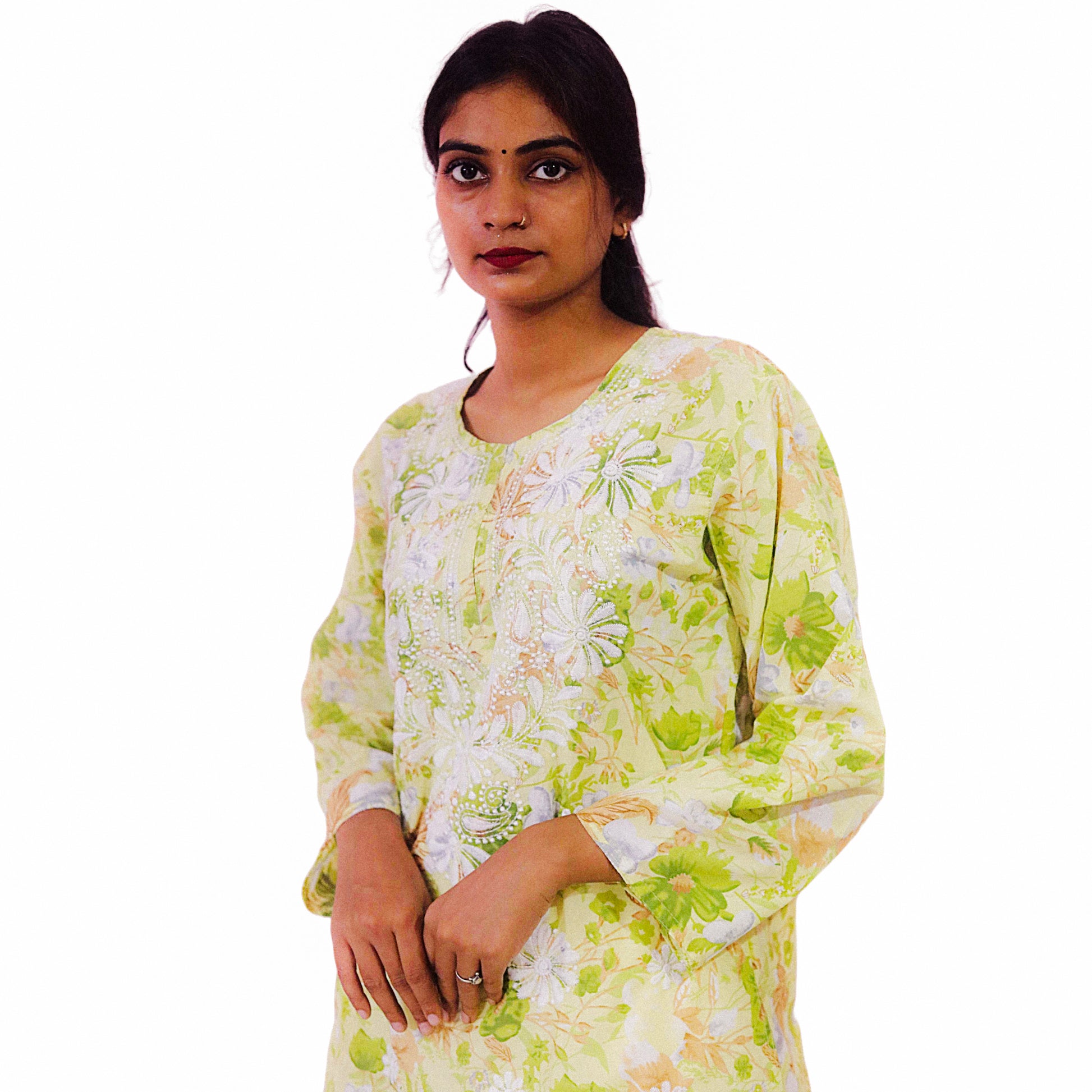 Women Printed Cotton Kurti with Embroidery Machine Work Kurta Top.